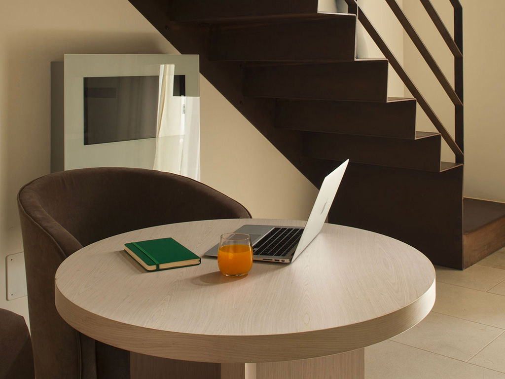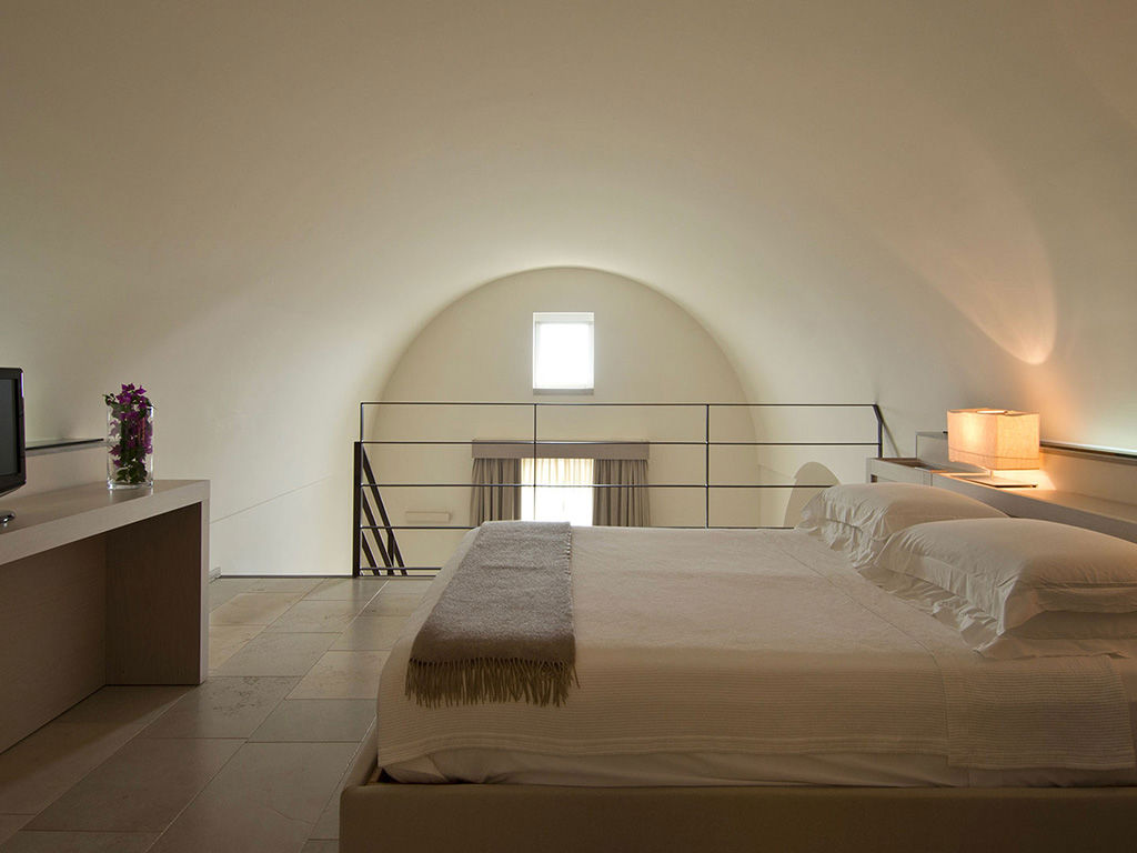 Il piano inferiore accoglie una zona living, mentre il soppalco ospita la camera matrimoniale, ideale per un soggiorno romantico.